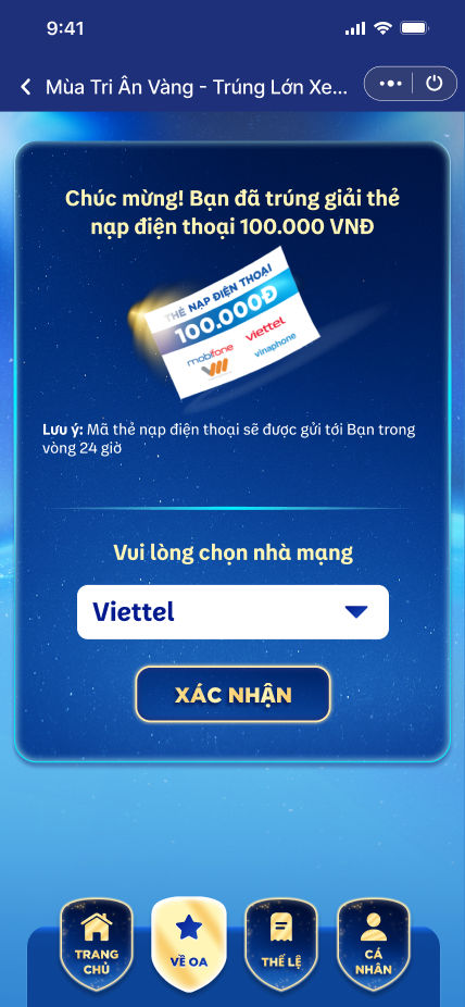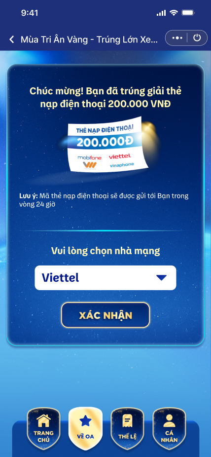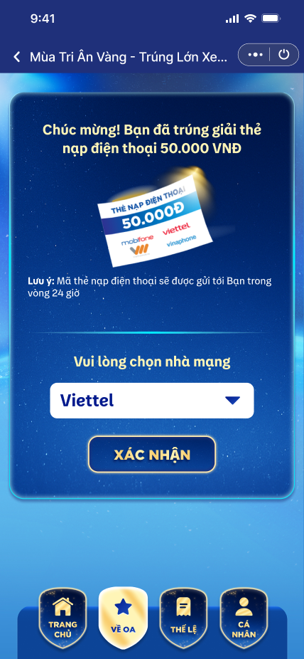 Khi xác định Mã QR dự thưởng hợp lệ, hệ thống sẽ tự động quay số trúng thưởng ngẫu nhiên các giải topup và công bố kết quả trúng thưởng giải topup và Ô chọn nhà mạng, để khách hàng chọn nhà mạng họ sử dụng. Hoàn tất bước này, hệ thống sẽ hiện giao diện xác nhận thành công và thông báo gửi mã thẻ nạp trong vòng 24 giờ thông qua tin nhắn Zalo. Khách hàng cần sao chép đoạn mã trong nội dung tin nhắn để nạp thẻ với cú pháp tương ứng của từng nhà mạng.