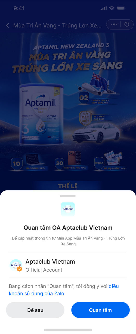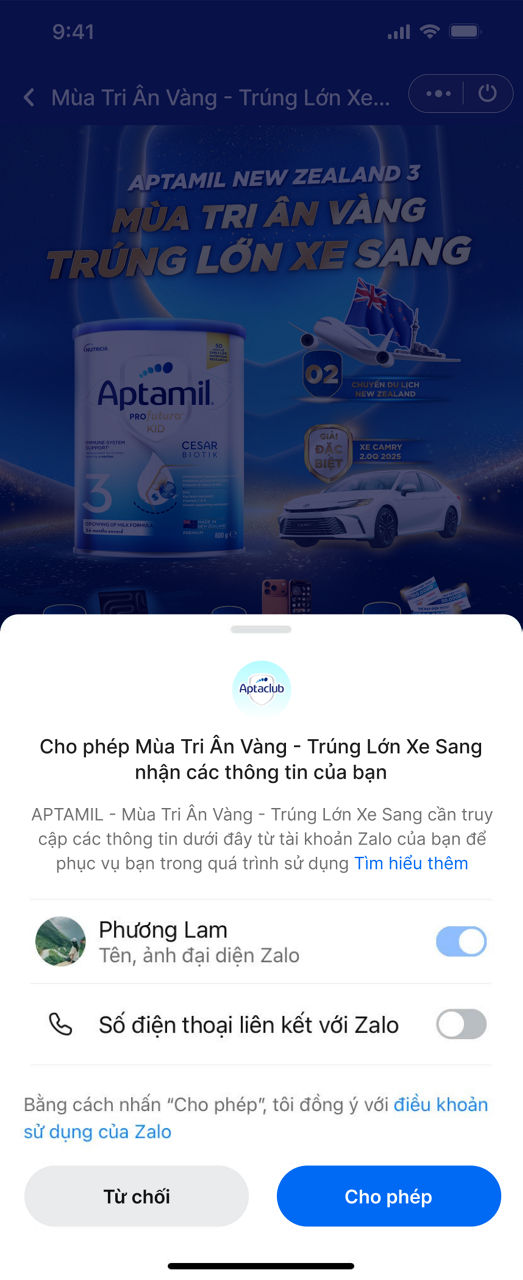 + Khách hàng nhấn chọn vào ô vuông: Theo dõi OA Aptaclub Vietnam để nhận thông tin giải thưởng. Khi Khách hàng nhấn chọn, ứng dụng sẽ hiện ra giao diện Quan tâm Zalo OA của Danone Việt Nam, khách hàng nhấn chọn “Quan tâm”. Sau khi nhấn “Quan tâm”, giao diện ứng dụng hiện ra “Cho phép APTAMIL – Mùa Tri Ân Vàng – Trúng Lớn xe Sang nhận các thông tin của bạn” . Khách hàng chạm vào chấm tròn và gạt về bên phải để chia sẻ “Tên, Ảnh đại diện Zalo” và “Số điện thoại liên kết với Zalo”. Sau đó khách hàng nhấn chọn “Cho phép”. Sau khi nhấn chọn “Cho phép”, ứng dụng chuyển sang giao diện Bước 3.