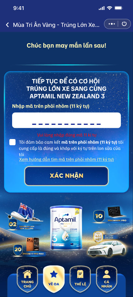 + Trường hợp khách hàng không trúng thưởng giải top up điện thoại, hệ thống sẽ thông báo Chúc bạn may mắn lần sau đồng thời giao diện thể hiện Ô nhập 11 ký tự trên phôi nhôm có 11 vị trí trống cần điền đủ để khách hàng thao tác, đảm bảo nhập đủ 11 ký tự và có Cơ hội thứ hai tham gia quay số trúng các giải thưởng lớn của chương trình.