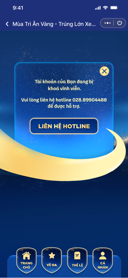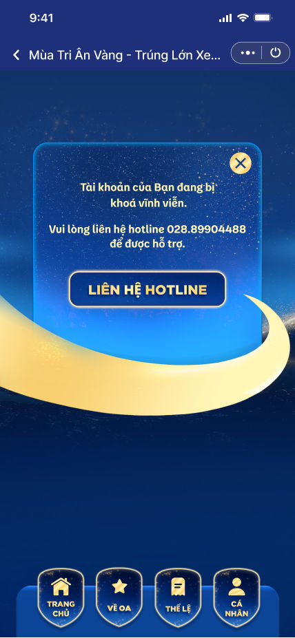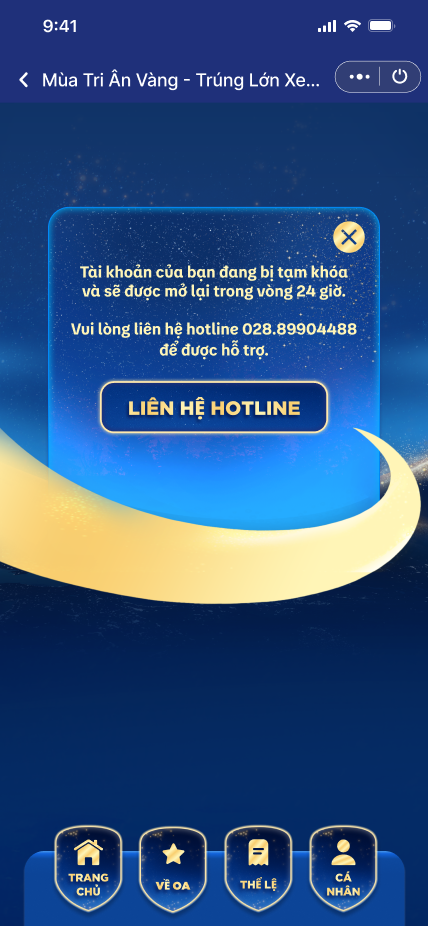 Khi bị tạm khóa hoặc khóa vĩnh viễn, ứng dụng sẽ hiển thị thông báo trên giao diện để khách hàng biết và thời gian được phép tham gia lại (nếu có), giao diện thể hiện như bên dưới.