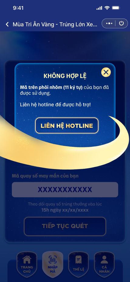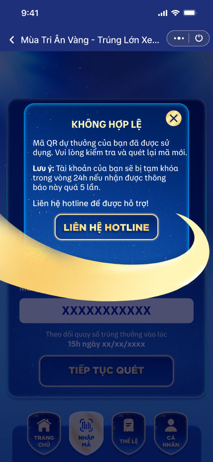 Lưu ý: Hệ thống của ứng dụng kiểm tra nhận thấy mã QR dự thưởng không hợp lệ và khóa tài khoản tham gia khi: