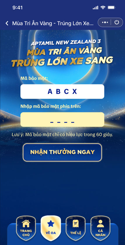 - Sau khi hoàn tất Bước 2, ứng dụng sẽ hiện ra giao diện yêu cầu khách hàng nhập Mã bảo mật do hệ thống cung cấp, thể hiện trên giao diện, khách hàng nhập mã bảo mật trong vòng 60 giây để xác định không phải là công cụ quét mã, khách hàng nhập xong nhấn chọn NHẬN THƯỞNG NGAY để gửi thông tin về hệ thống ứng dụng. Hệ thống của ứng dụng sẽ tự động xác minh Mã dự thưởng của khách hàng (Mã dự thưởng gắn với Mã QR dự thưởng dưới dạng 1 dãy ký tự gồm 6 chữ và số được hệ thống ghi nhận tự động khi khách hàng quét mã QR dự thưởng) và phản hồi tại Ứng dụng cho khách hàng với các trường hợp sau: