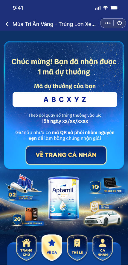 3. Mã dự thưởng tham gia cơ hội quay số trúng thưởng do hệ thống ứng dụng con gửi cho khách hàng (xem chi tiết tại Bước 3 mục 8.1.2). Mã dự thưởng là 1 dãy ký tự gồm 6 chữ và số được hệ thống tự động cấp sau khi khách hàng quét mã QR dự thưởng và nhập đúng mã trên phôi nhôm gồm 11 ký tự; mã dự thưởng được lưu trên hệ thống ứng dụng Zalo và là căn cứ để quay số xác định trúng thưởng các giải Đặc biệt, Nhất, Nhì, Ba. Tin nhắn thông báo trúng thưởng từ Zalo của Aptamil (Xem chi tiết tại mục 8.5).