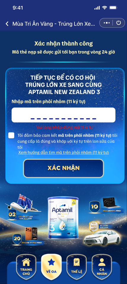 - Khách hàng mua Sản phẩm khuyến mại (nằm trong mục 2- Hàng hoá dịch vụ được khuyến mại) có dán tờ thông tin chương trình khuyến mãi trên nắp hộp APTAMIL PROFUTURA KID CESARBIOTIK 3 GROWING UP MILK FORMULA trong thời gian quy định từ 08 giờ 00 phút 00 giây ngày 12/12/2025 đến 22 giờ 30 phút 00 giây ngày 12/02/2026, tìm mã QR dự thưởng theo hướng dẫn trong tờ thông tin chương trình khuyến mãi dán trên nắp cùng với 11 chữ số trên phôi nhôm bên trong hộp sản phẩm và tham gia chương trình khuyến mại bằng cách thực hiện đầy đủ lần lượt các bước trên ứng dụng con Zalo.