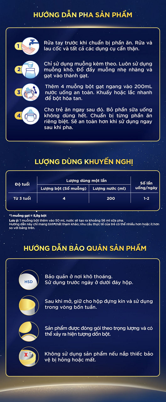 Dùng muỗng có sẵn để lấy bột sữa và cho vào cốc/ly. Cứ 30ml nước tương ứng với 1 muỗng bột.