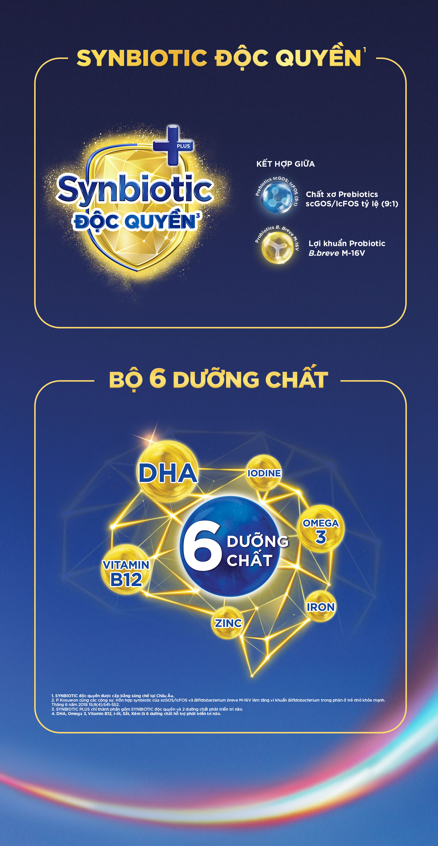 Thành phần: Sữa tách béo (sữa bò), Lactose (sữa bò), Sữa nguyên kem (sữa bò), Hỗn hợp dầu thực vật (dầu cọ olein, dầu hạt cải, dầu dừa, dầu hướng dương), bột đạm whey (sữa bò), Galacto-oligosaccharides (GOS) (sữa bò), Acid decosahexaenoic (DHA) (Dầu cá), Các khoáng chất (Tri natri citrat, Calci carbonat, Dicalci phosphat, Kali clorid, Dikali phosphat, Tri kali citrat, Magnesi clorid, Kali iodid, Sắt (II) sulfat, Sắt (III) pyrophosphat, Kẽm sulfat, Đồng sulfat, Mangan sulfat, Natri selenit, Tri calci photphat), Fructo-oligosaccharides chuỗi dài (IcFOS) (rễ rau diếp xoăn), Maltodextrin (Ngô), Các vitamin (Vitamin C (Natri-L-ascorbat), Vitamin A (Retinyl acetat), Vitamin B3 (Nicotinamid), Vitamin B5 (D-pantothenat, calci), Vitamin E (DL-alpha-tocopheryl acetat), Vitamin D3 (Cholecalciferol), Vitamin B1 (Thiamin hydroclorid), Vitamin B6 (Pyridoxin hydroclorid), Biotin (D-biotin), Acid folic (Acid pteroymonoglutamic), Vitamin K1 (phytomenadion), Vitamin B2 (Riboflavin), Vitamin B12 (Cyanocobalamin)), Chất nhũ hóa (Lecithin đậu nành, INS 322(i)), Bifidobacterium breve M-16V, Taurin, Cholin clorid, L-carnitin, Inositol, Beta-caroten, Chất điều chỉnh độ acid (Kali hydroxyd, INS 525; Calci hydroxyd, INS 526; Acid citric, INS 330), Chất chống oxy hóa (Ascorbyl palmitat, INS 304; Tocopherol concentrat (dạng hỗn hợp), INS 307b; dl-alpha-Tocopherol, INS 307c).